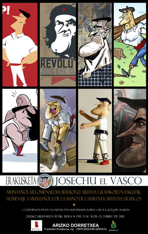 Nacido en Barcelona en 1914 en el seno de una familia con tradición en el campo editorial, Muntañola empezó su prolífica carrera profesional a mediados de los años 30 en publicaciones catalanas como El Be Negre, L’Esquitx, Xut! y En Patufet. A principios de los años 40 se asoció con Francisco Rovira-Beleta para crear la productora de animación CEIDA, con la que realizó varios cortos de dibujos animados protagonizados por el "Faquir González", en colaboración con Josep Escobar. ![]() También en esa época dirigió la revista Atalaya, hasta el año 1947, y en 1955 puso en marcha la revista de humor Locus, que apenas duró dos años tras tener tropiezos con la censura. En los años 40 trabajó para el entonces célebre TBO y creó personajes como "Josechu el vasco", "Angelina y Cristobalito" y "Doña Exagerancia". En 1944 empezó su colaboración con "El Correo Catalán" que duró hasta la década de los ochenta, en 1945 comenzó a hacerlo para "El Mundo Deportivo", y en 1962 se incorporó a La Vanguardia donde publicó una viñeta diaria hasta 1984. ![]() El mes de abril, un grupo de dibujantes vascos emprendió a través de Facebook el proyecto de conmemorar a Muntañola a través de su personaje “Josechu el vasco”. Y funcionó. Mediante sus dibujos han tratado de ofrecer su particular visión de un personaje que para ellos fue el precursor de un mundo que les apasiona, el de los superhéroes. ![]() La respuesta al llamamiento superó las previsiones. La variedad de los trabajos y su calidad nos han animado a programar una muestra con una selección de obras que tendrá lugar del 5 al 31 de octubre en Arizko Dorretxea de Basauri. El proyecto de exposición nace con el mismo objetivo con el que vio la luz la iniciativa, homenajear a Muntañola a través de su personaje. ![]() El homenaje recoge desde una fusión entre el Mayor Grubert, creación de Giraud, y Josechu, hasta un collage basado en la tradición costumbrista. Desde una mezcla entre el personaje y su creador hasta varios montajes fotográficos. En color y en blanco y negro. Surrealistas y fieles. Trazos de ilusión y respeto en honor a dos figuras inspiradoras. A Josechu y a Muntañola. ![]() | |||